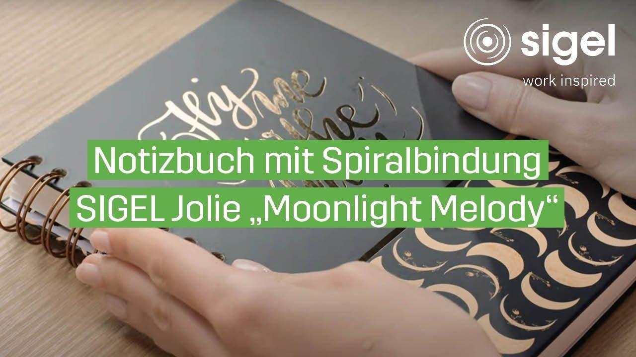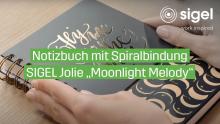 Das Video zeigt das SIGEL Spiral-Notizbuch Jolie JN625 im Design „Moonlight Melody“ in verschiedenen Perspektiven und Alltagssituationen. Zu Beginn liegt das Notizbuch geschlossen auf einem Schreibtisch. Die Kamera zeigt das Cover in Nahaufnahme. Das Design „Moonlight Melody“ besteht aus einem dunklen Hintergrund mit feinen, silbrig schimmernden Linien und Mustern, die an eine nächtliche Szenerie erinnern. Die Spiralbindung ist silberfarben und ergänzt das elegante Erscheinungsbild.Im Verlauf des Videos wird das Notizbuch aufgeklappt, um die Spiralbindung und die innere Ausstattung zu zeigen. Die Seiten sind punktkariert (dotted) und perforiert, sodass sie leicht herausgetrennt werden können. Eine integrierte Einstecktasche im hinteren Bereich wird ebenfalls gezeigt, ideal zum Aufbewahren von Notizen, Fotos oder kleinen Zetteln. Die Kamera zeigt, wie sich das Notizbuch vollständig umklappen lässt, was durch den 360°-Umschlag und die stabile Spiralbindung ermöglicht wird. Das Notizbuch hat das Format ca. A5 und eignet sich besonders für kreative Anwendungen wie Handlettering, Bullet Journaling oder persönliche Notizen. Die hochwertige Verarbeitung, das FSC-zertifizierte Papier und das moderne Design stehen im Mittelpunkt der Präsentation.