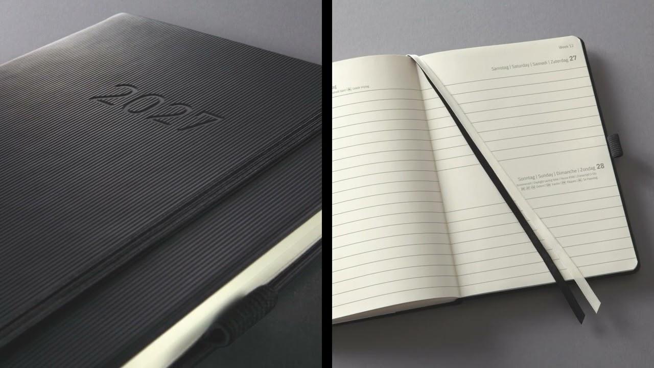 The cover has a rippled surface that is pleasant to the touch and makes the planner an elegant companion. Its practical information section and many useful features are bound to impress. For example, you will always have a pen on hand in the elastic pen loop, and the perforated note pages are ideal for jotting down and passing on notes. Organise your appointments and notes with the stylish stickers included. Top quality and superb design - you will simply love this bound planner.