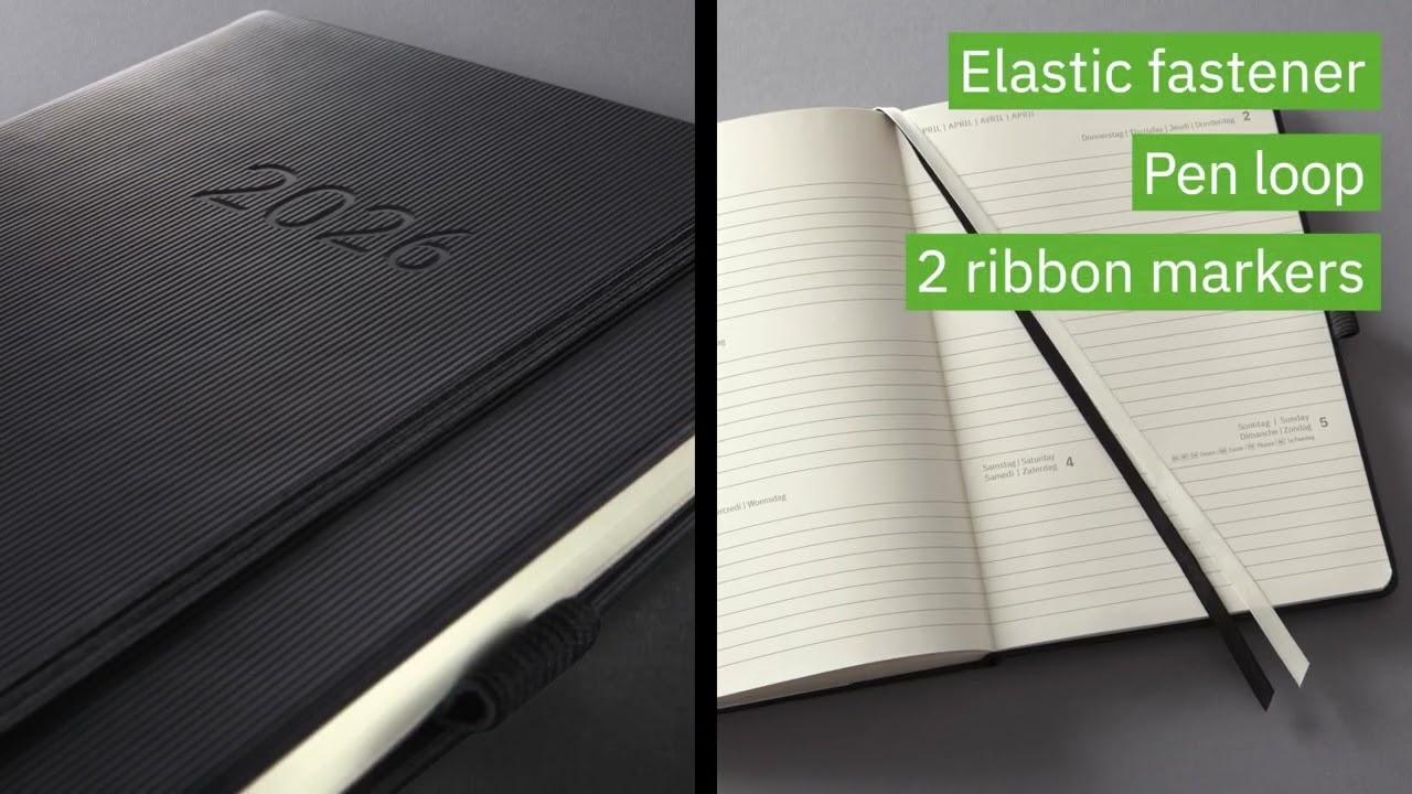 The cover has a rippled surface that is pleasant to the touch and makes the planner an elegant companion. Its practical information section and many useful features are bound to impress. For example, you will always have a pen on hand in the elastic pen loop, and the perforated note pages are ideal for jotting down and passing on notes. Organise your appointments and notes with the stylish stickers included. Top quality and superb design - you will simply love this bound planner.